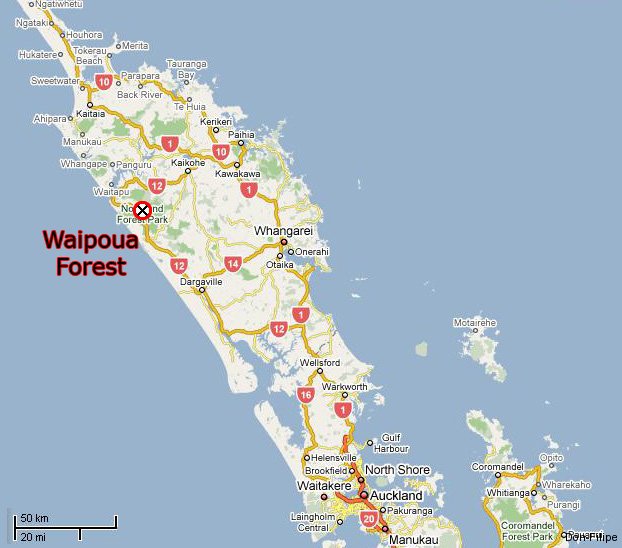 Waipoua Forest Park ist ein Wald in der Region Northland im nördlichen Teil der Nordinsel Neuseelands. Dieser liegt etwa 120 km westlich von Whangarei und 270 km nordwestlich von Auckland, was für mich einen ca. 3 Stunden langen Ritt auf meinem stählernen Ross bedeutet hat.