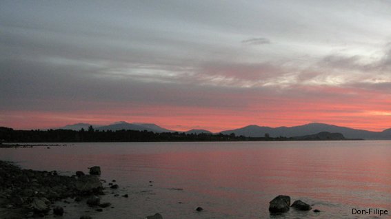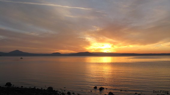 Der Blick schweift über den immensen Kratersee Taupo in Richtung des atemberaubend schönen Sonnenuntergangs.