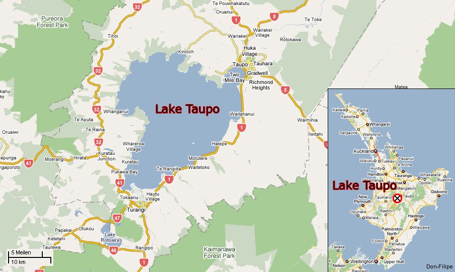 Am Nordufer befindet sich die Stadt Taupo in der wir in der Nacht von Samstag auf Sonntag übernachtet haben. Am äußersten Südufer liegt Turangi wo wir in der Nacht von Freitag auf Samstag übernachteten. Entlang des östlichen Ufers verläuft der State Highway 1 in mehr als geschlängelter Art und Weise. Die streckenweise „vorgeschlagene“ Höchstgeschwindigkeit von 25 km/h wurde, im eigenen Interesse, mehr als eingehalten.