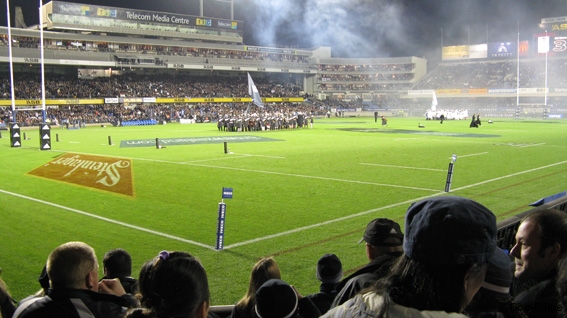 Es wurde unglaublich Laut im Stadion, als die Englischen Spieler auf das Feld gekommen sind. Riesen Applaus und Getobe! Doch als die All Blacks das Stadion betraten, da brachen die Tore der Hölle auf. Alle sind aufgestanden, und haben losgebrüllt. ALL BLACKS, ALL BLACKS …..